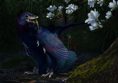 El autor ha ubicado a Microraptor en el suelo, a la sombra de un bosque que lo cubre casi por completo. La escasa luz que logra filtrarse permite ver la iridiscencia de su plumaje , según los descripto en 2012 en base al estudio del espécimen BMNHC PH881. Lo cubre principalmente follaje de Ginkgoale Baiera -presente en esa misma formación- y ramas de una planta magnólida, de la cual se tiene registros de presencia en la formación Jiufotang a través de trazas de polen y por los restos encontrados en el estomago del ave fósil Jeholornis, en dicha formación.